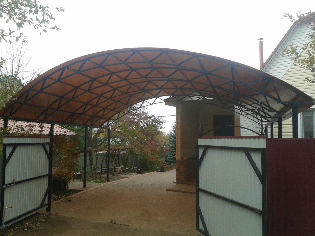 Она может быть арочной или прямой, односкатной или двускатной. Каждый вид имеет свой внешний вид и характеристики, поэтому первоначально учитывается, какие функции будут выполняться навесом, а также какие другие материалы будут использоваться во время работы. Дополнительно берутся в расчет личные предпочтения владельцев сооружения. - Решается, какими размерами будет обладать будущее сооружение, причем если увеличивается высота навеса, то возрастает его несущая способность, поэтому во время работы непременно монтируются надежные и прочные ребра жесткости, повышающие прочность всей конструкции.